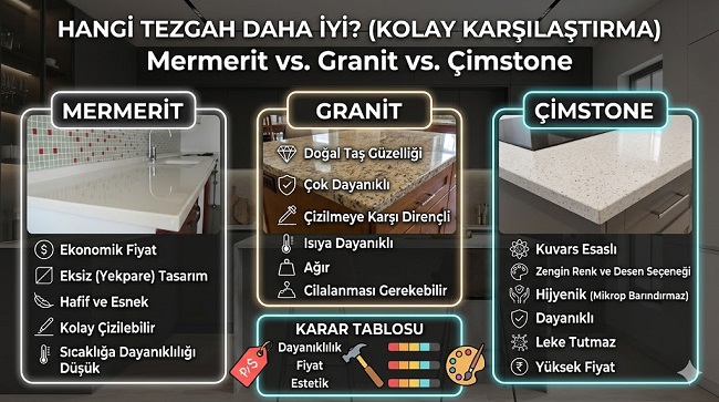 Mutfak tezgahım mütait tarafından yapılan ahşap bir tezgah. Eğer üstüne bir cilalama yapmazsam ya kararıyor ya da eskiyor. Özel bir ilacı var onu vernik mantığıyla sürmek gerekiyor. Artık bunlarla uğraşmak istemiyorum. Yeni bir tezgah almam iyi olcak. Çimstone yaptıranların çok olduğunu biliyorum ama mermerit granit çimstone gibi çeşitler mevcut aynı zamanda. Hangisi işimizi görür ve böyle ömürlük olur?